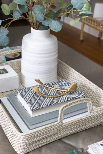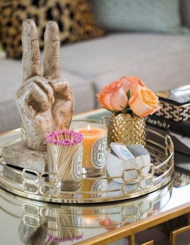 1. Use a tray – This is key for beginner decorators. A tray forces you to use only the space provided and sets boundaries for decorative objects eliminating the need for “clutter.” Also, if you have a round coffee table, a square tray can make decorating so much easier.
