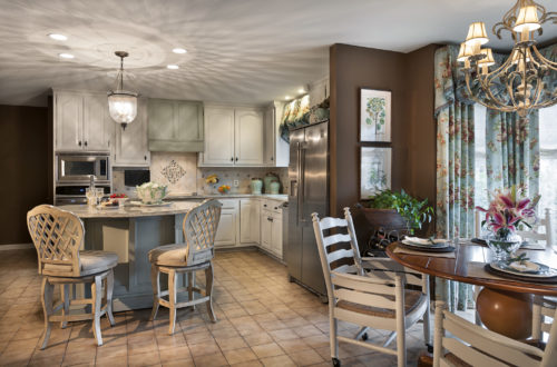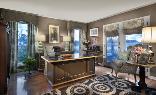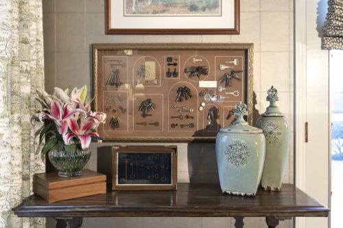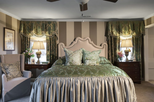 This home overlooks the intercoastal waterway framing a spectacular view. In order to frame the view and take full advantage of the comfortable feeling that the client required, we utilized warm cozy furnishings with a soft romantic color palette. The result is spectacular and marries the desired livability and yet, enhances the view with an inviting frame. The client is an avid collector of many varieties. From typewriters, silhouette drawings, keys, milk glass, and even buttons, the homeowner wanted to utilize as many of these collections as possible within the space. To accommodate, we created unusual ways to display a variety of collections and even created options to rotate the collections seasonally. To dress up the master suite and make it appear larger, vertical stripes were incorporated. The use of painted stripes is a signature of ours and we’ve employed them in all fashions. In this case, the goal was to make the ceilings look taller yet, to keep the space calm and restful, the stripes were done in a soft tone on tone mocha! Custom made drapery and bedding completed the comfortable luxurious feeling.