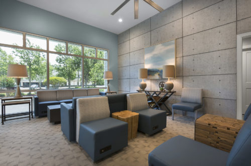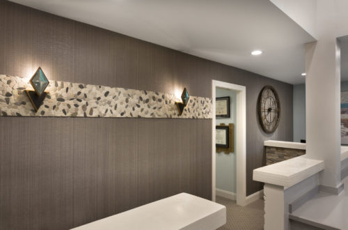 After a heartbreaking fire, this busy dentist office was due for a functional, yet calming makeover! Using a mix of materials, both nostalgic (notice the tree counter charging station) and modern (the concrete polystyrene blocks on one wall). The blend is both soothing and calming as well as interesting and exciting!