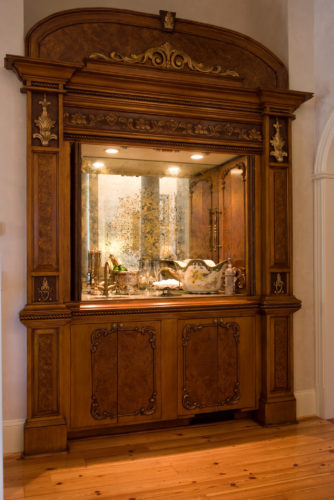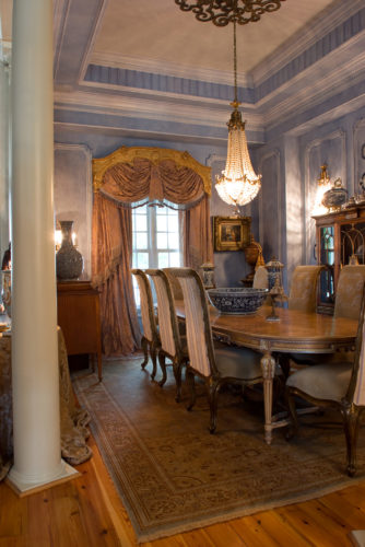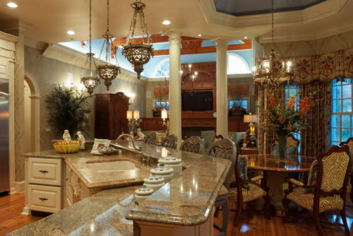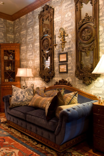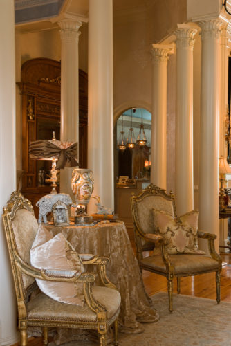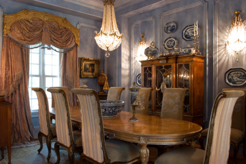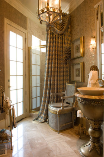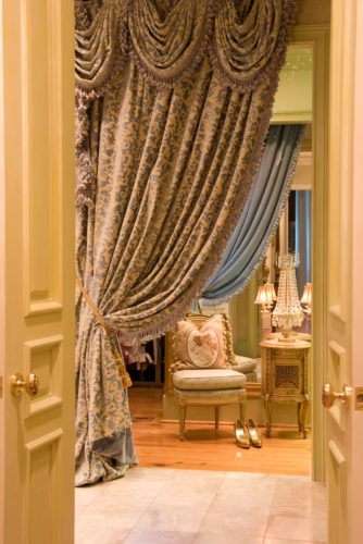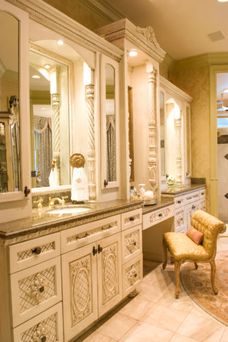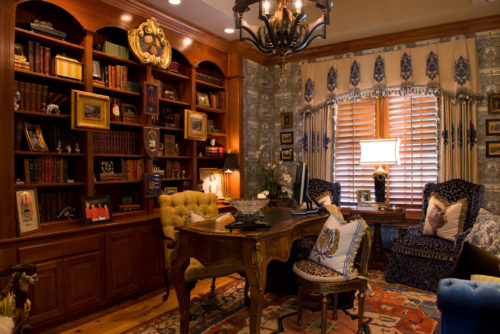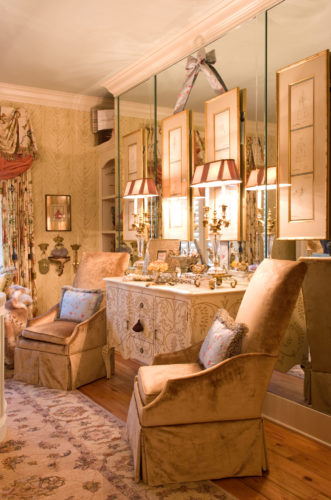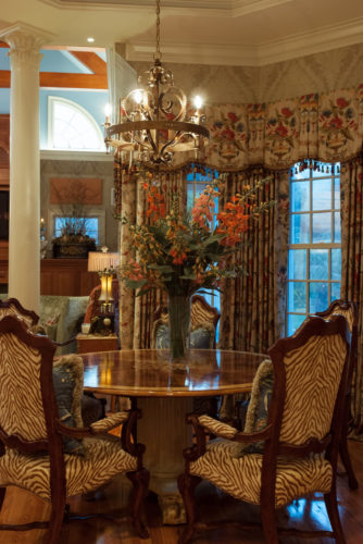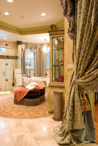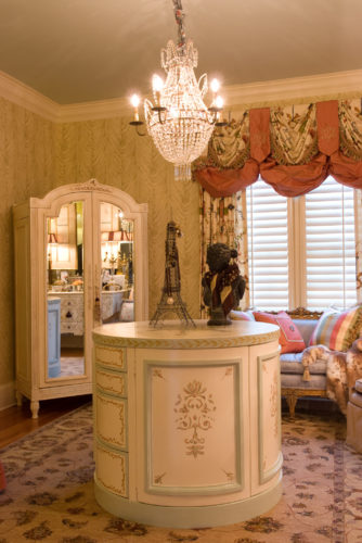 We affectionately refer to this home as the “the Biltmore House” as it is resplendent in opulence and grandeur! Featured in numerous magazines locally, regionally and nationally, this home underwent a complete renovation and transformation. Layered lavishly, each room includes custom built pieces. The chair toilet featured in the powder room was hugely popular as a conversation piece. Many of the furnishings were procured in Italy including the master bed, living room chairs and the front hall entry chest. Miles and miles of fabrics completed the lavish draperies some of it even hand painted. The goal: create a space steeped in layers and luxury. The homeowners proclaimed, “even so, Kimberly still managed to create spaces that we could relax and live in.” This home is full of ideas including a play nook for the homeowner’s little girl which was conveniently tucked under a stairwell right off the kitchen and hand painted by a local artist in a “La Petite Chef” motif! Both homeowners are clothes horses so we hand painted designer labels throughout the master closet. For jewelry storage, a giant jewelry island was custom built as a centerpiece to house lots and lots of jewelry complete with a built-in safe! This home is magnificently grand and oh so beautiful!